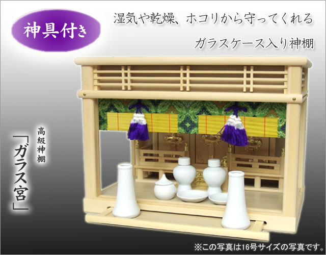◆レビュー割5%OFF!◆【お得な神具付きセット!】?送料無料!?神棚・神具 『ガラス宮 M16号+神具セットA』 価格: 32,550円 レビュー評価: 5.0 レビュー数:3 ホコリがかからずお手入れ簡単な箱宮。豪華な御簾が特徴で、当店の箱宮の一番人気商品です。 材質 ヒバ材 サイズ 外寸法:巾48×高さ38,5×奥行き32(cm) 内寸法:巾29,5×高さ25,5×奥行き4,2(cm) 金具 真鍮メッキ 備考 ※高さ25,5cmまでの御札を入れる事が可能です。 ※本製品は手作りの為、サイズが多少異なる場合がございます。又、天然材を使用しておりますので、木目や色は商品ごとに異なります。 神具7点セット(小) 瓶子×2個 高さ83×直径53(mm)白皿×2枚 直径67(mm)榊立×2個高さ110×底径60(mm) 水玉×1個高さ61×直径50(mm)◆『ガラス宮 Mシ Supported by 楽天ウェブサービス |
